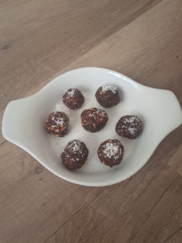 Malzemeleri mutfak robotundan geçirip, karışımı toplar şeklinde yuvarlayarak hindistan cevizine bulayıp servis edebilirsiniz.